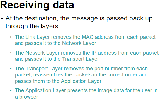 This layer is the physical connection between the nodes and adds the MAC address of the NIC of the source and destination computers. This is so that once the correct network is found using the IP address, it can then locate the correct piece of hardware using the MAC address. The destination MAC address is only the address of the destination router if it is being sent across networks. That’s why it needs the link layer when travelling between routers in the above diagram. If it is only within a network, the destination MAC address will be the destination device.