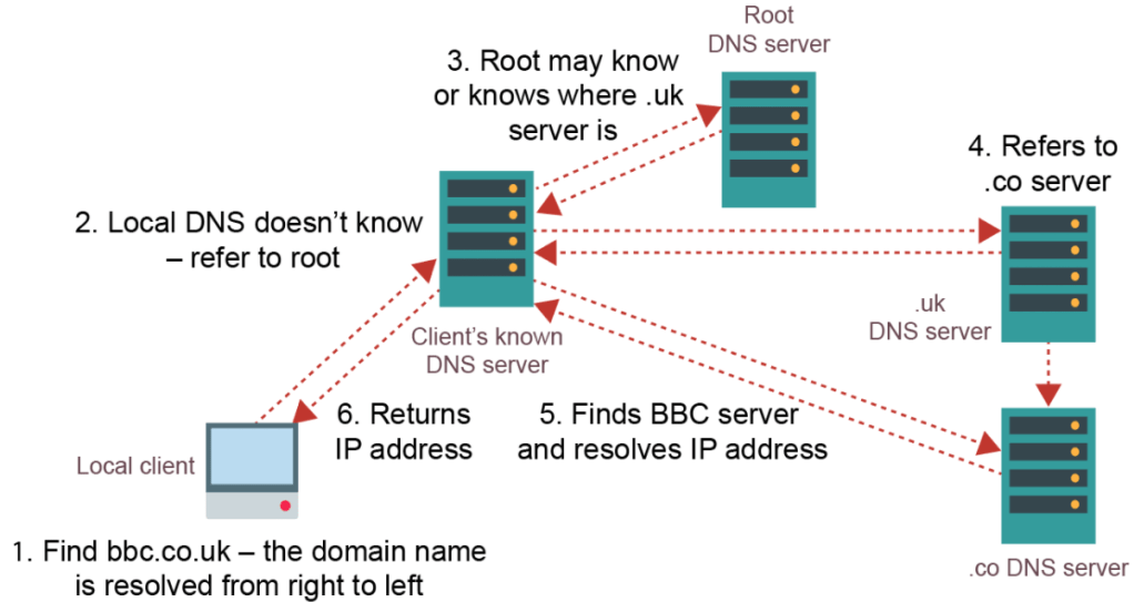 A domain name identifies the area or domain that an internet resource resides in. Each domain has a corresponding IP address. The DNS server stores a catalogue of all domain names and IP addresses. When a browser sends a request for a URL, it receives this URL and sends back the corresponding IP address which the browser will then use to connect to the resource. We use domain names instead of directly using IP addresses as they are easier to remember. For example: